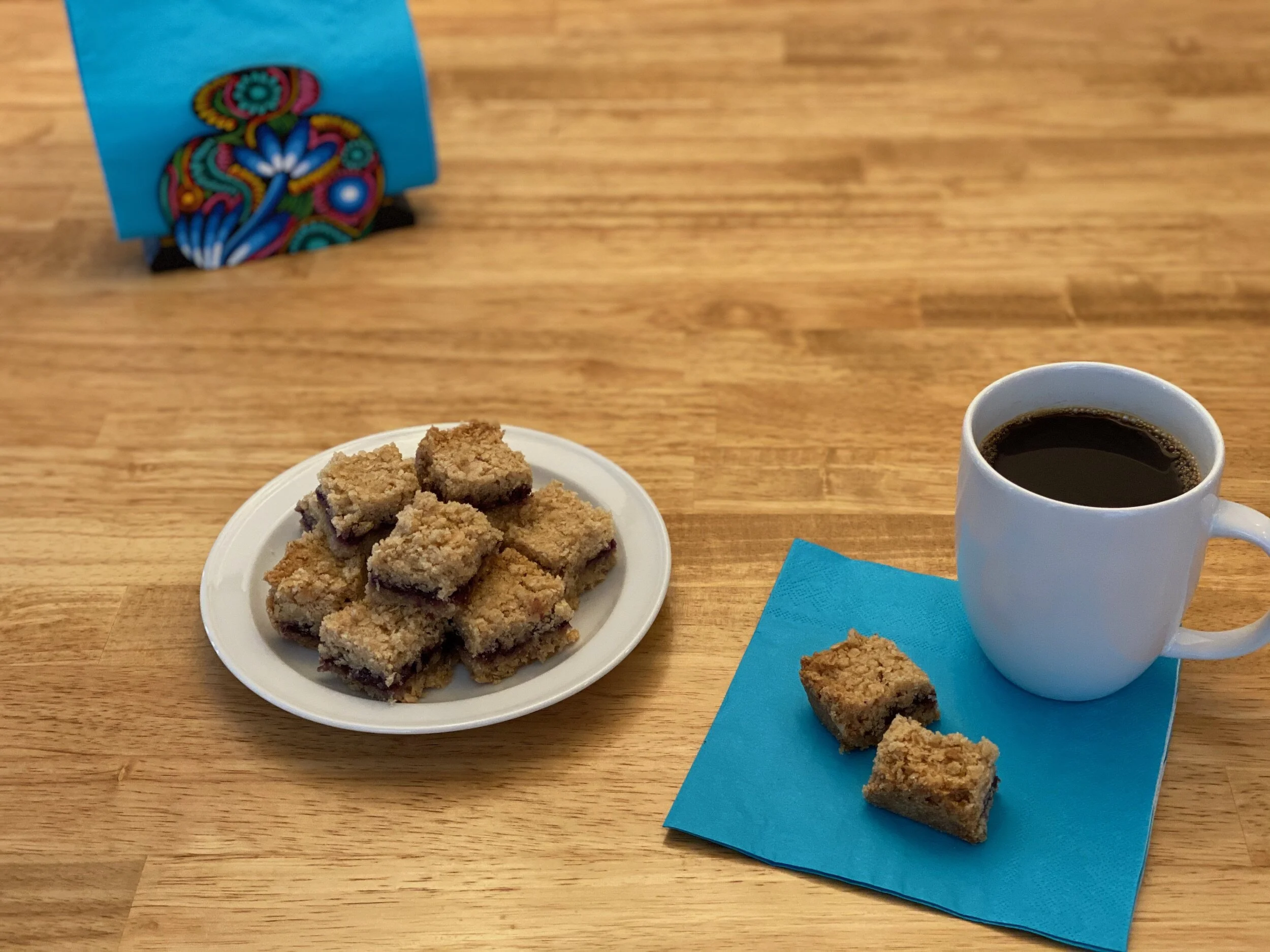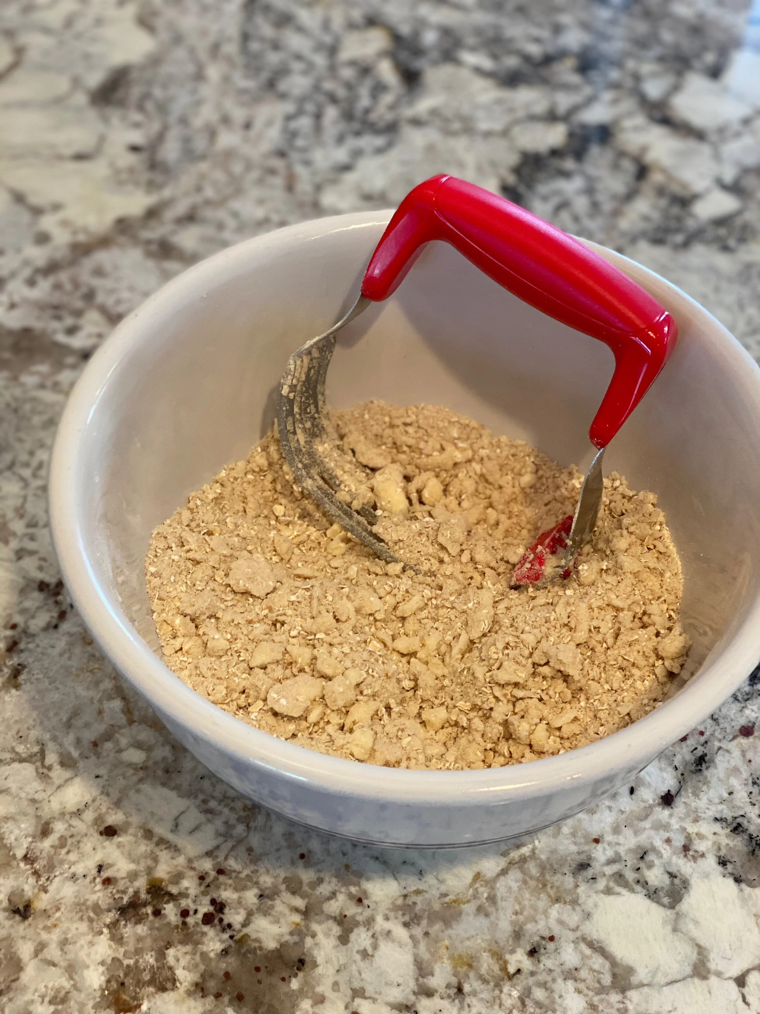 Mix in sugar & rolled oats. Work in butter with pastry cutter until crumbly. (Can use mixer, but the dough should be crumbly, not formed.)