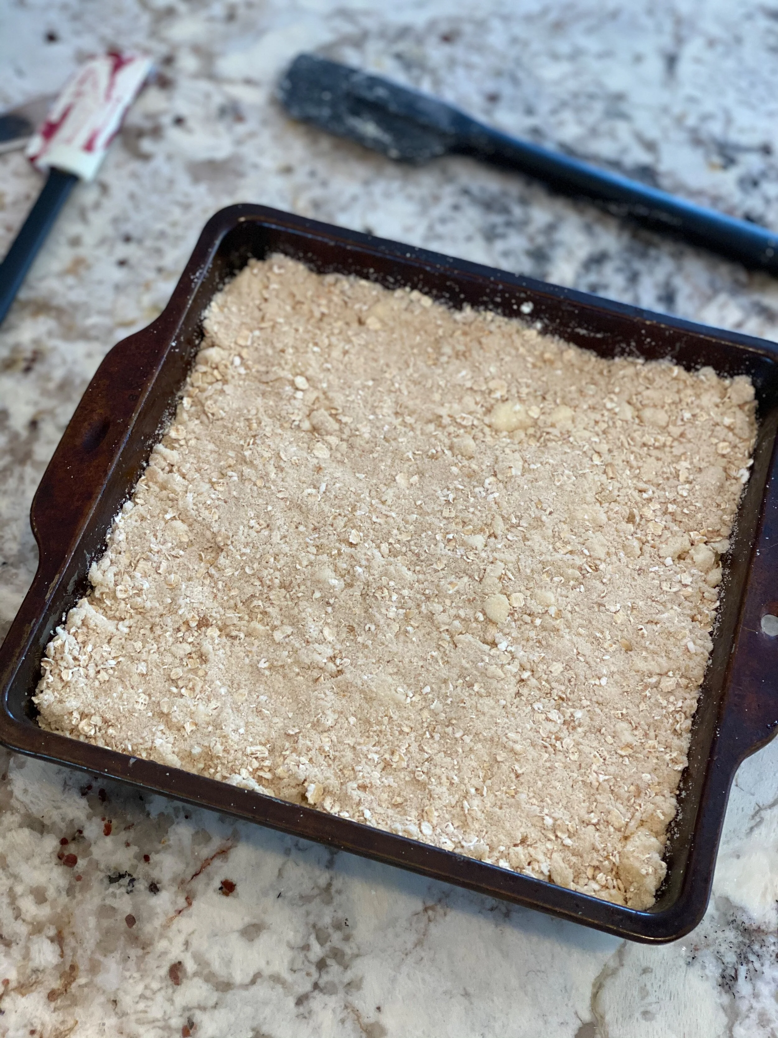 Press ½ of mixture into 8x8” pan sprayed with GF baking spray.