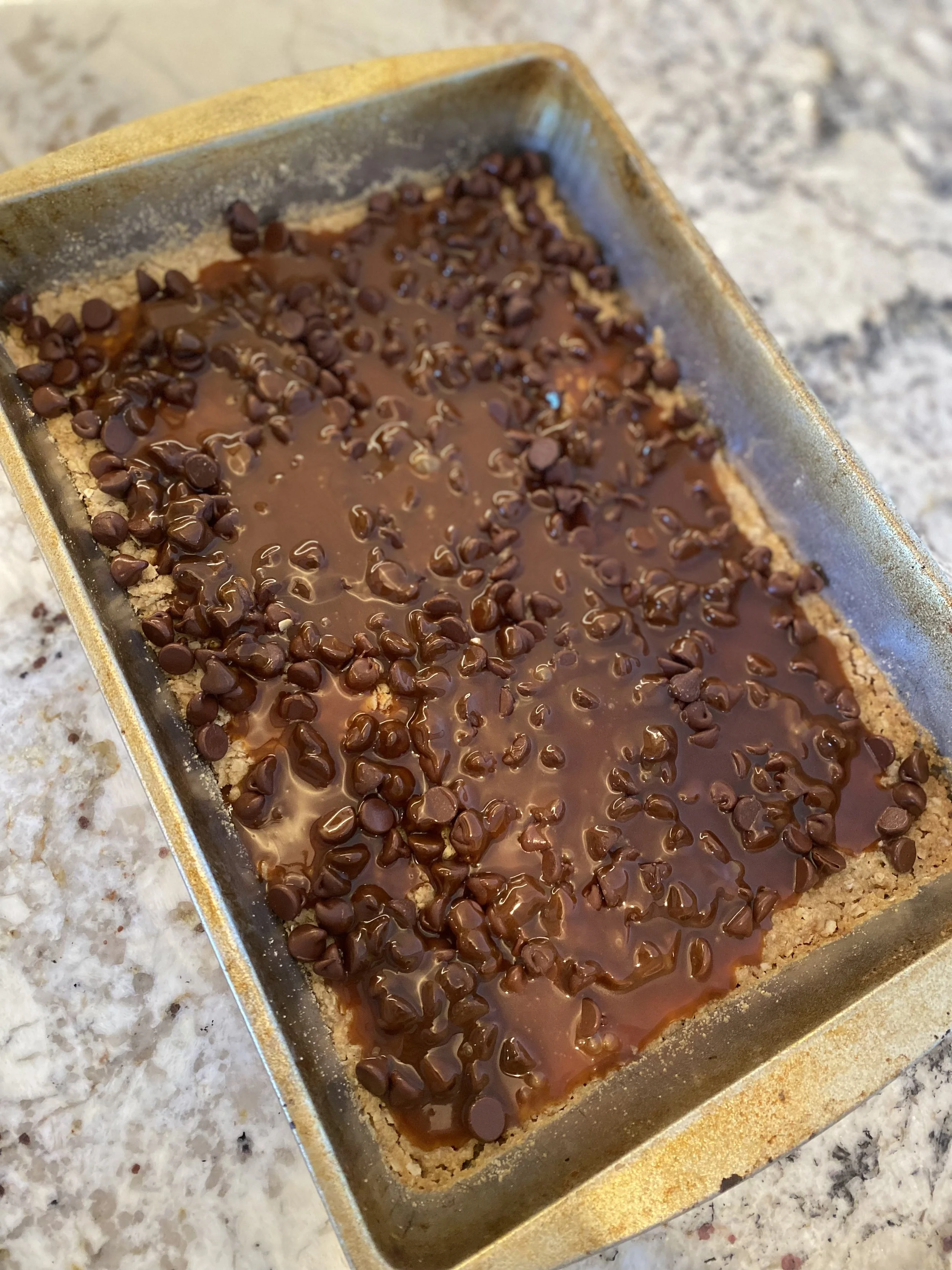 Sprinkle warm base with chocolate chips. Pour caramel ice cream topping over chocolate chips