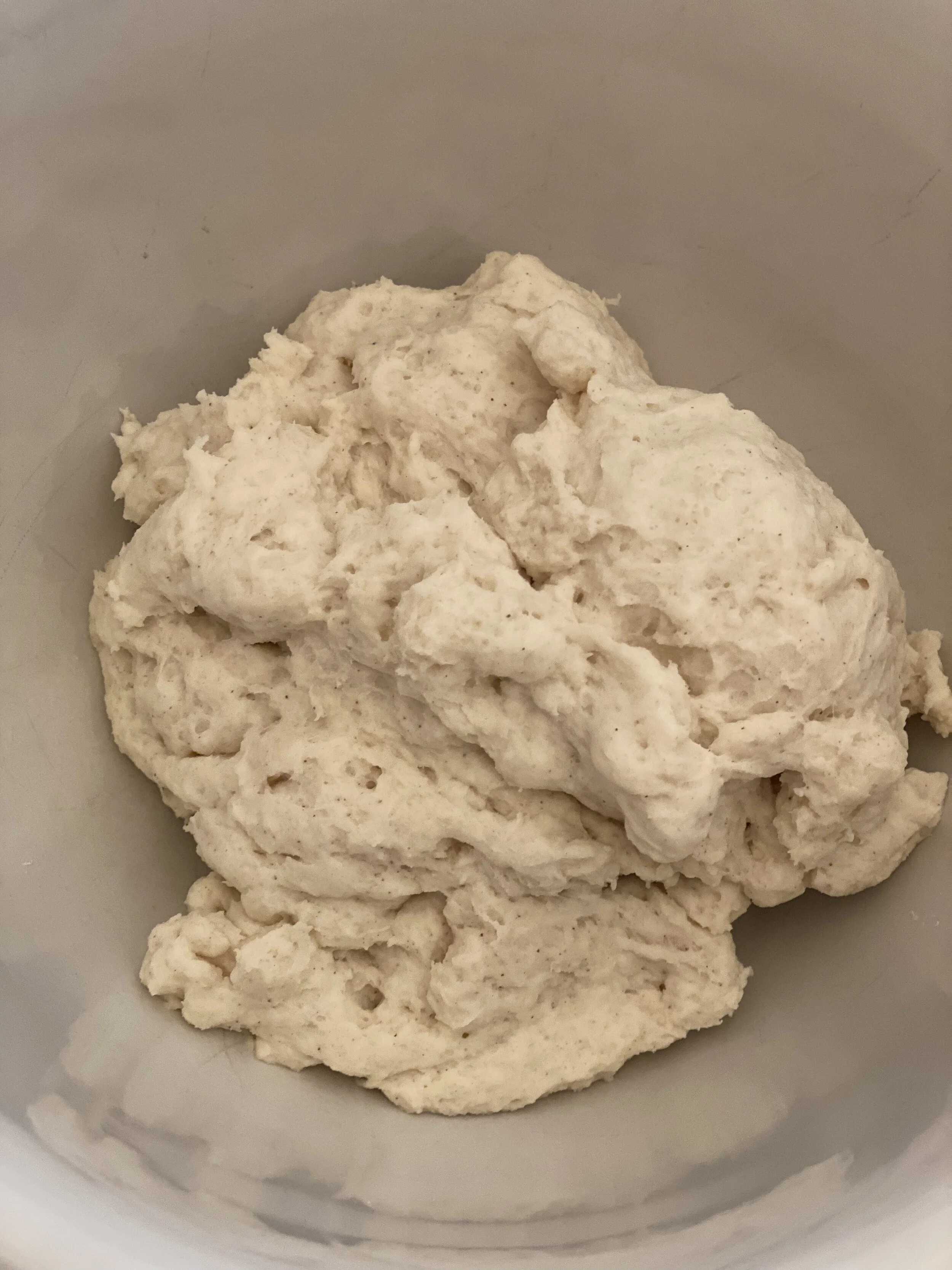 When the yeast is ready, pour into flour mixture & mix until dough forms. The original recipe recommends a dough hook, but I prefer the paddle attachment on my mixer. (The dough hook on my mixer didn’t seem to really mix the dough very well.) The dough will be soft & sticky.